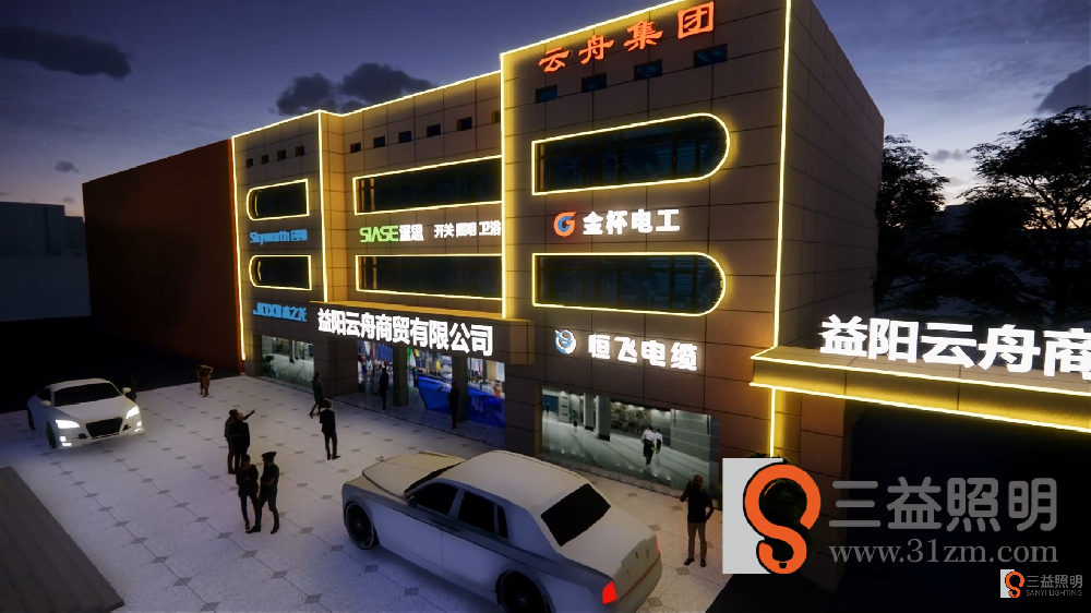 益陽市云舟商貿(mào)公司外墻燈光設(shè)計,設(shè)計采用LED無縫線條燈,不銹鋼發(fā)光字。