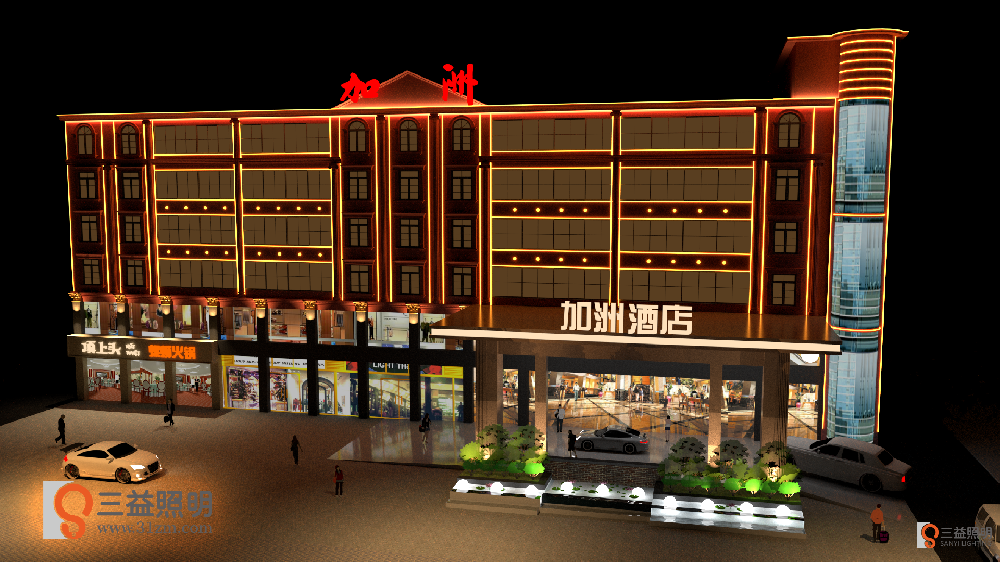 益陽加洲酒店外墻亮化工程設(shè)計,本工程設(shè)計采用DMX512線條燈、DMX512硅膠燈制作全彩效果。
